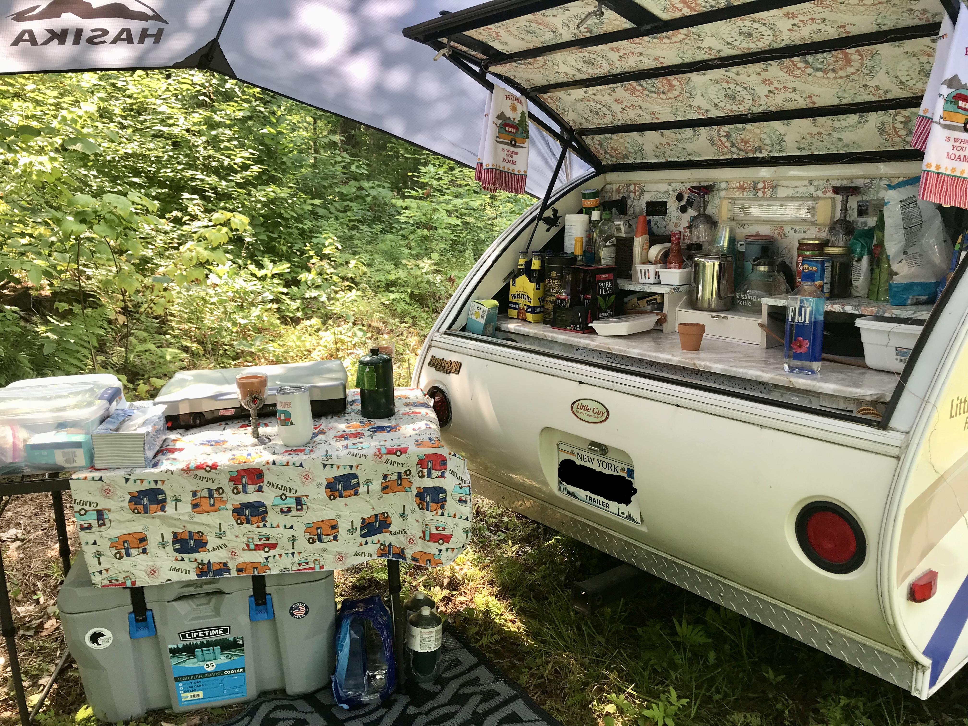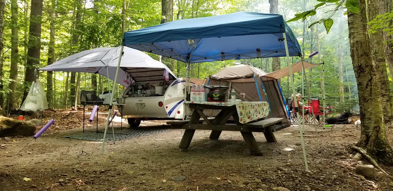 Hubby took this photo of our site all set up for rain. First trip of the season it DID NOT RAIN. Now we know what to do to keep the rain at bay… Be prepared for it!