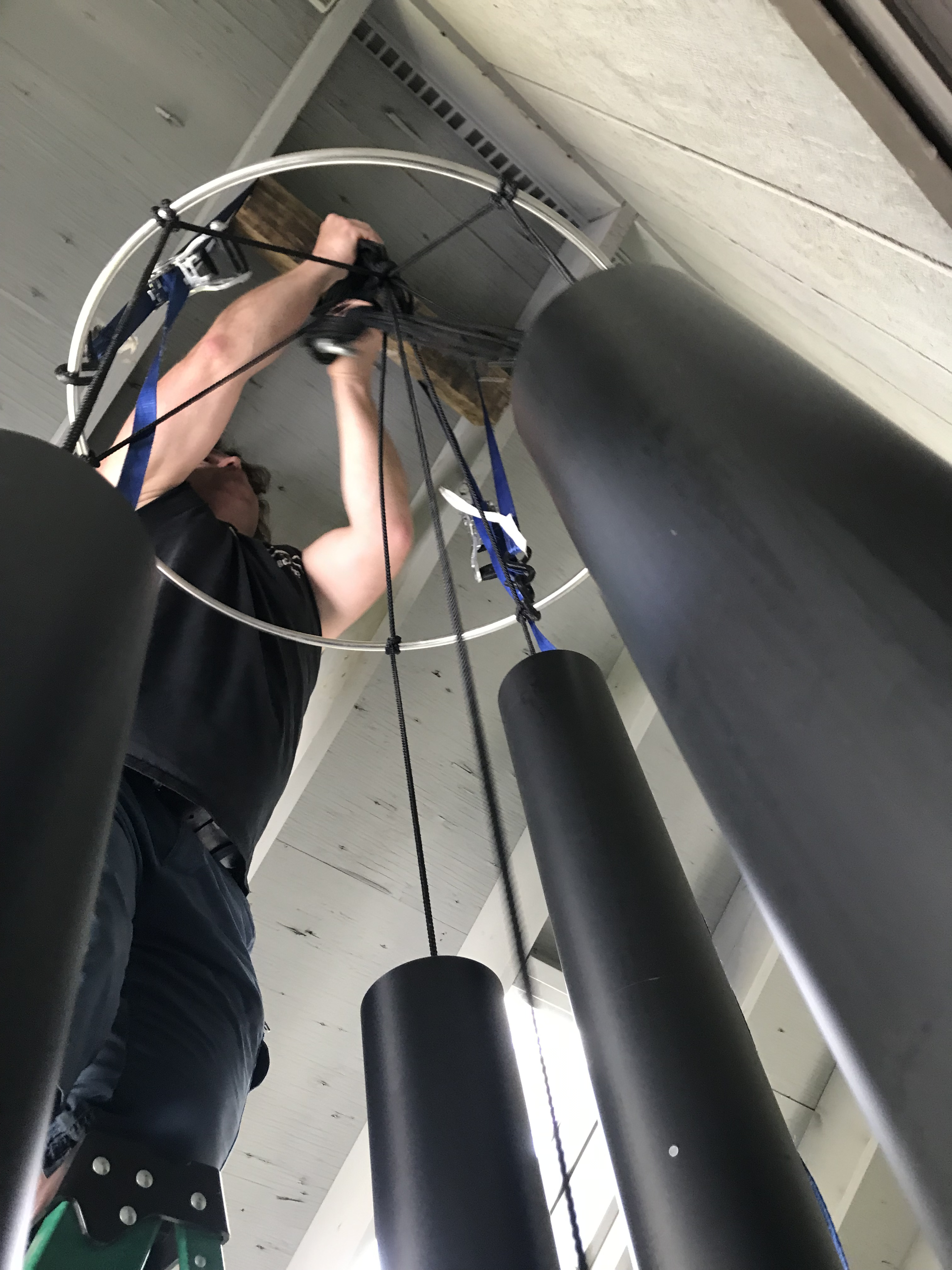 My husband, David, helping in the lifting and suspension of the chimes. They’re HUGE!