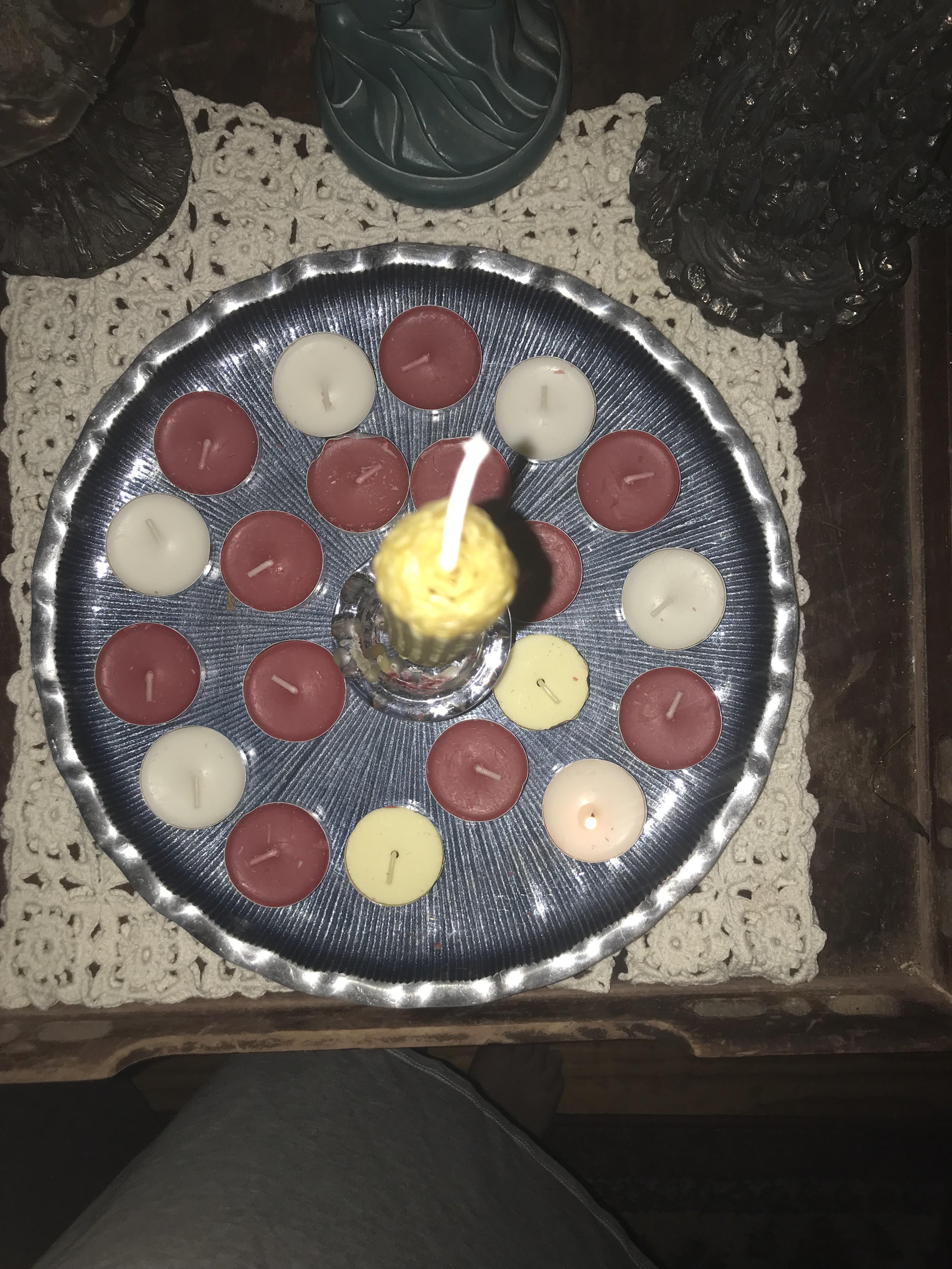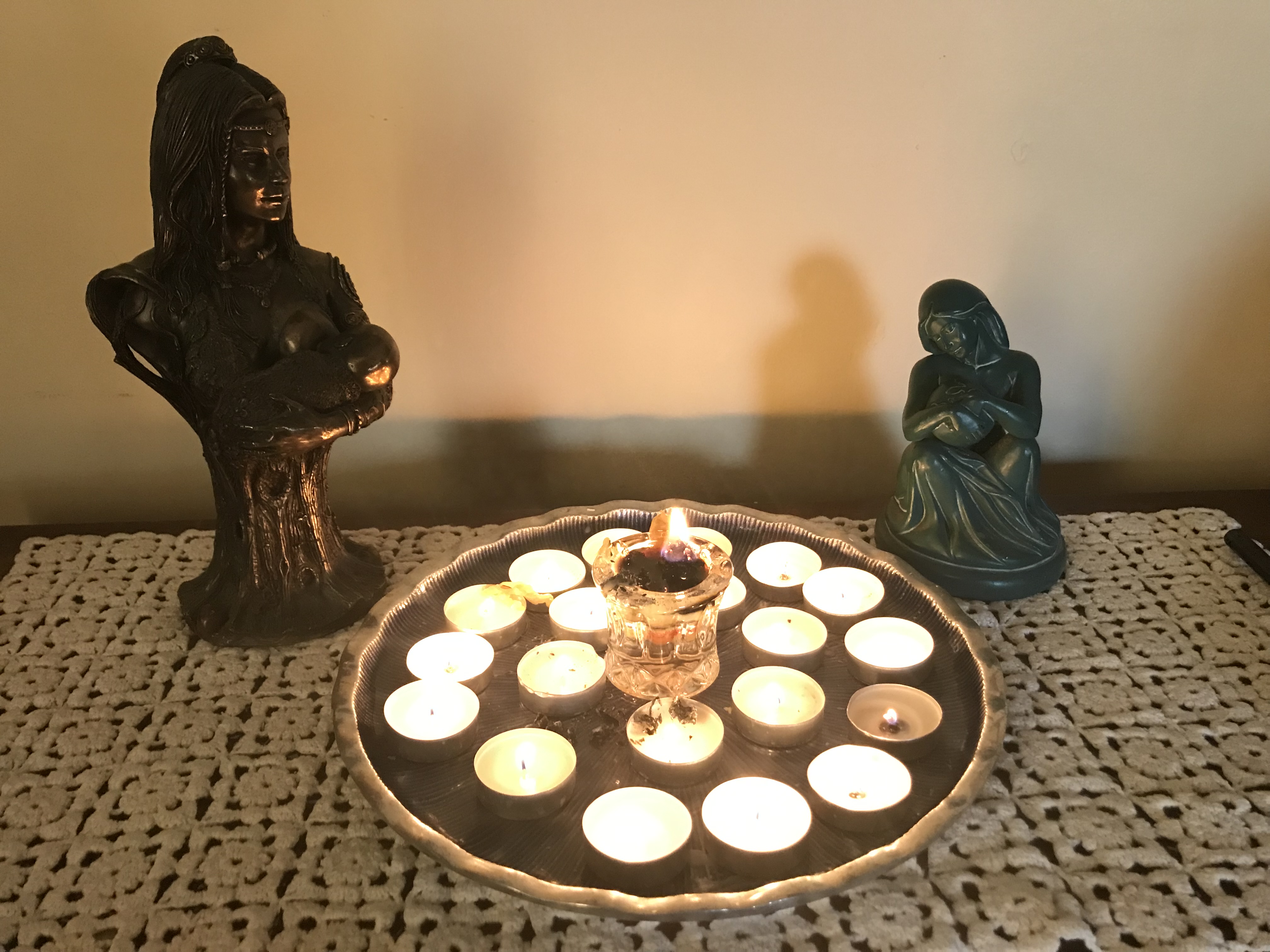 My husband David and I set up a spiral consisting of 20 tea lights, with one pillar candle at center on a metal tray. We arrange the tealights in a counterclockwise pattern (or widdershins) as we are ushering out the darkness with every candle lit. Some might say we should set the spiral in a clockwise or deosil pattern, to help manifest light.