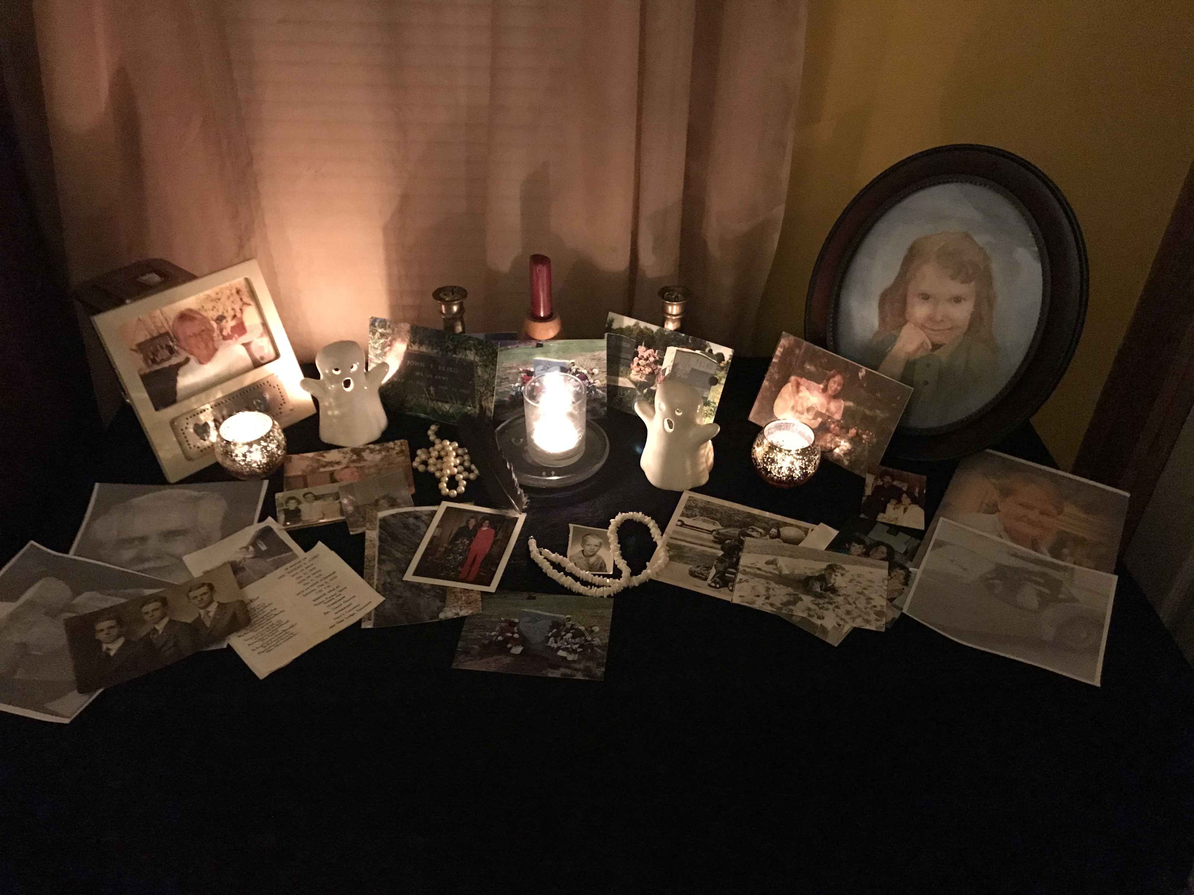 Everyone who gathers brings a dish/drink/dessert that is connected to the loved one they are remembering that night. All the dishes are left in the kitchen, where we gather to share our stories about our loved ones. Then we fill a plate for the dead, which we place at the end of the table (Dead Head), and then we fill our plates and cups and join them for the meal-which is eaten in complete silence.